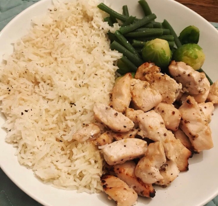- Honey and mustard chicken with rice – this is way up there with my favourite dishes now. I marinated 1 chicken breast in honey and mustard seeds on Sunday evening and then cooked this for dinner on Monday with some pure basmati rice, green beans and brussel sprouts