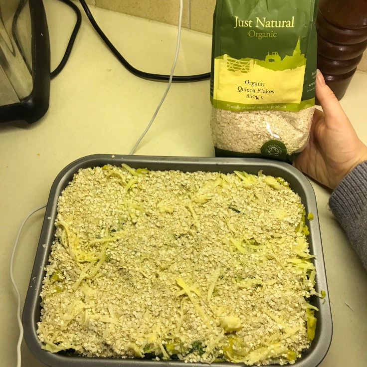 To make this cod cake we cooked 2 plain cod fillets in the oven first, for 20 minutes at 180 degrees. Whilst they were in the oven we boiled and mashed 3 large potatoes. Once the fish was cooked we pulled it apart into small flakes and added it to the mashed potato, along with garam masala powder, turmeric powder and spinach. We mixed everything in and then transferred it to a baking tray which we based with olive oil. We spread the mix into the tray evenly, then added a layer of VoiLife cheese – which we then topped with quinoa flakes. We then placed everything in the oven for 15 minutes at 180 degrees. Whilst it was cooking we boiled some brussels and broccoli to have as a side.