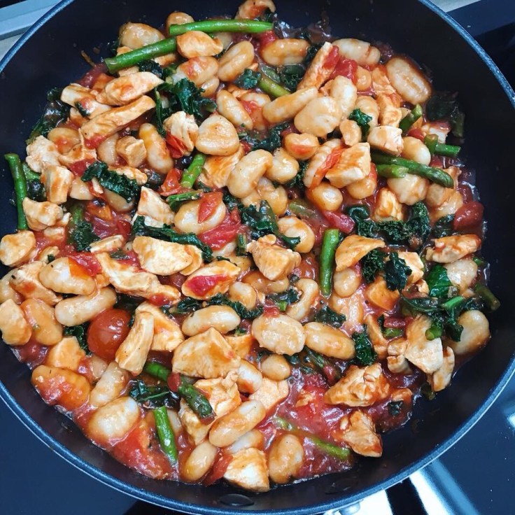 I chopped up 2 large chicken breasts and placed them in a fry pan, with olive oil, to cook. Whilst the chicken was cooking I boiled a saucepan of water and added salt, as soon as this started to bubble I added all of the gnocchi. Once the chicken in the frying pan started to cook, I added chopped asparagus. After another 5 minutes I added the kale. Once the kale started to wilt I added a full jar of Marks & Spencer cherry tomato and balsamic sauce to the chicken, asparagus and kale, then left it to simmer for 5 minutes. Whilst it was simmering I drained the gnocchi and then added it in with the the sauce and stirred until covered.