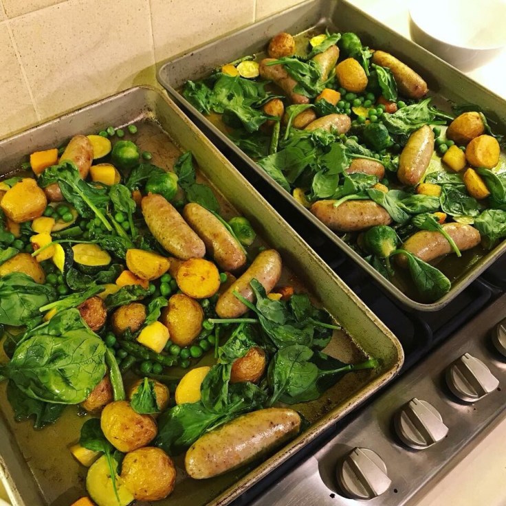 We used Tesco finest pork sausages with potatoes, parsnips, butternut, brussels, broccoli, peas, green beans, courgettes and spinach all cooked in one tray with turmeric powder on top. Everyone loved the meal and it was great to be able to eat as a family with no cross contamination concerns! It was really easy to prep and make too – we heated the oven to 180 degrees, added a little olive oil to two baking trays, then added the sausages. Once the sausages were in the oven we spent 10 minutes prepping the veg. We then added everything except the brussels, broccoli and spinach, to the trays for a further 20 minutes, with turmeric powder sprinkled on top. After 20 minutes, we added the remaining veg and more turmeric powder to the trays for a another 10 minutes. Then everything was ready to dish up!