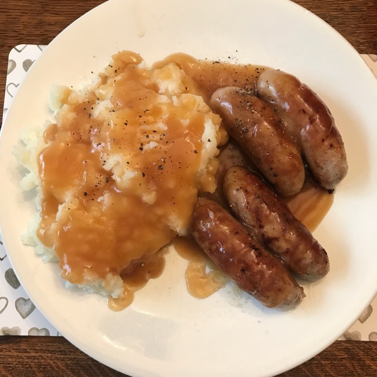 - Sausage, mash and gravy – I use 2 large potatoes per person, Tesco Finest pork sausages and Tesco’s own gluten free chicken gravy