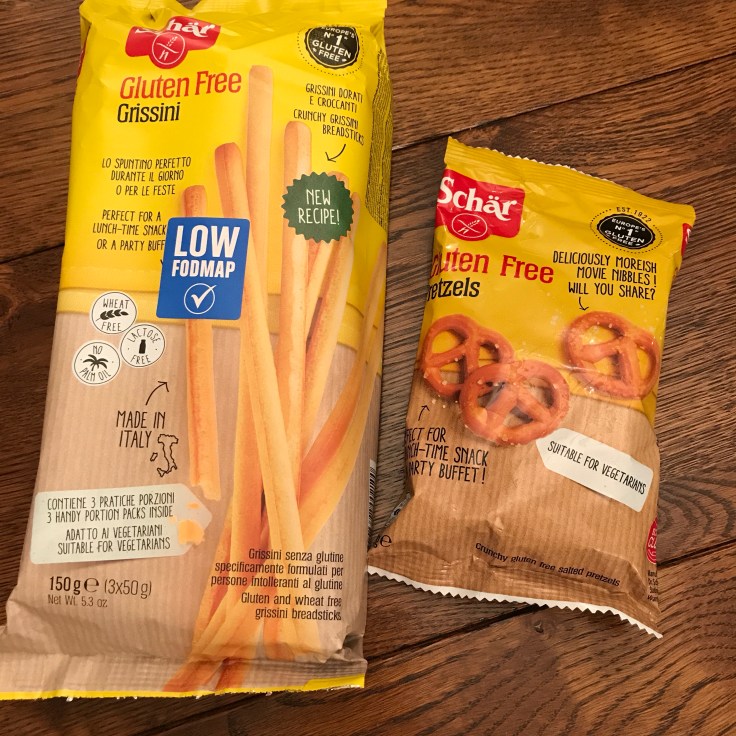 - Schar – Schar is probably one of the most well-known gluten free brands. They have so many delicious snacks that I’ve tried over the past 12 months. They make gluten free bourbons and custard creams as well as gluten free pretzels and crackers – unfortunately these products do contain either lactose or soy, but if you’re only gluten free they are great snacks to try! I can have their breadsticks, they are delicious, I’d definitely recommend them