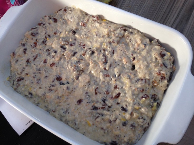 - Add the sultanas, sugar, whisked eggs and lemon zest, then stir it all in
